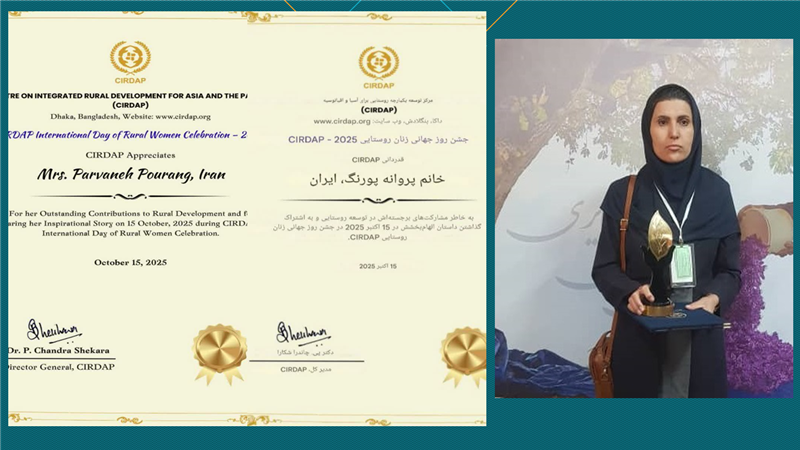 «خانم پروانه پورنگ نمونهای شایسته از زنان روستایی توانمند است که با تعهد، خلاقیت و تلاش مستمر، الگویی الهامبخش برای جامعه زنان روستایی در منطقه و کشورهای عضو به شمار میآید.»